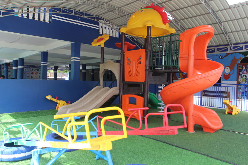 - A spacious outdoor area featuring a colourful play structure with slides, tunnels, and climbing features—perfect for safe, active fun and developing motor skills.